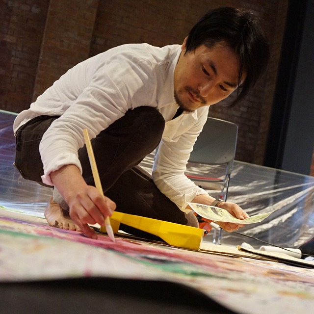 Sahara makes paintings and video works by acrylic paints with using plenty of water. He has been operating our physical sense for trying to draw aromas as a workshop "Kanko-club − Viewing Aromas", and also he makes works between still paintings to movies as "Motion Paintings".